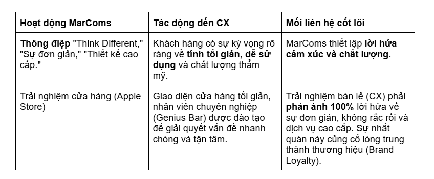 Đối với Apple, trải nghiệm thực tế (CX) chính là MarComs hiệu quả nhất. Mọi điểm chạm đều là một cơ hội để củng cố giá trị cốt lõi đã được quảng bá.